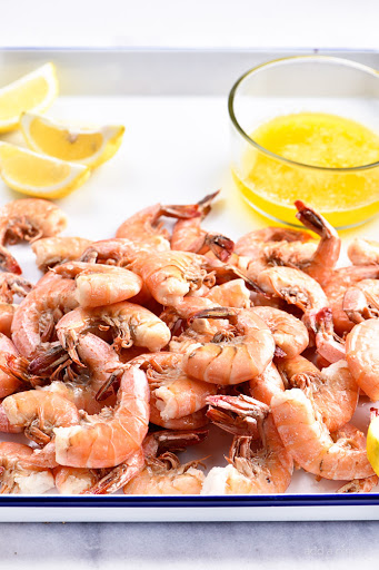 Add water and salt to a large stockpot set over medium heat. Bring to a boil and allow to boil for 5 minutes. Stir in the raw shrimp, cover and remove from heat. Allow to rest for about 8 minutes, until all the shrimp are cooked through. Pour the shrimp and liquid into a colander to strain. Transfer the shrimp to a serving bowl or platter. Serve warm or cover tightly with plastic wrap and chill for at least one hour in the refrigerator if serving cold. Serve with lemon wedges.For the Garlic Butter Sauce: