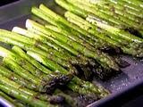 Break off the tough ends of the asparagus and, if they're thick, peel them. Place the asparagus on a baking sheet, drizzle with olive oil, then toss to coat the asparagus completely. Spread the asparagus in a single layer and sprinkle liberally with salt and pepper. Roast the asparagus for 25 minutes, until tender but still crisp.