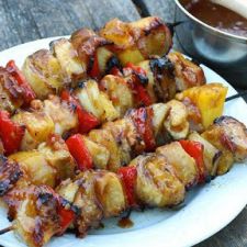 Lay a large piece of tin foil on your grill and spray it with cooking spray. Set the chicken kabobs on the foil. Cook for about 8 minutes per side. When the chicken has cooked through brush each kabob with Sweet Baby Rays BBQ Sauce. Allow them to cook for 2 to 3 additional minutes so the sauce has a chance to heat through. Serve with additional BBQ Sauce.