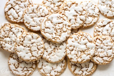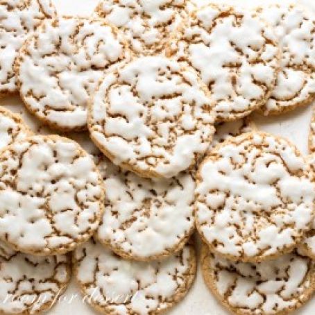6.To prepare the icing combine the confectioners' sugar with the milk or cream and water. Whisk until the sugar is dissolved and the icing is somewhat thick. Place the icing in a shallow dish or container, about 4x4 inches. Quickly dip the tops of the cooled cookies into the icing and let the excess drip off. Set the dipped cookie on the rack until the icing has set.