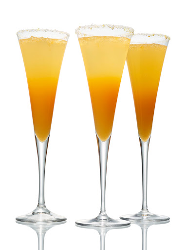 Put the sugar on a small plate and sprinkle the lemon and tangerine zests on top. Rub the rims of 6 champagne glasses with the lemon wedge, then gently roll in the zesty sugar.