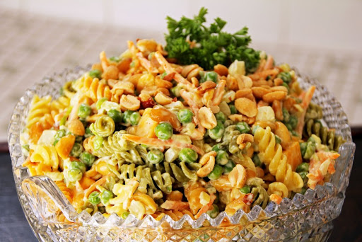 Cook macaroni according to package directions; drain and chill in cold water; Cook peas and carrots according to package directions, drain and chill in cold water; drain. Put macaroni and vegetables in a bowl and toss with peanuts, cheese, chopped eggs and onion. In a small bowl combine mayonnaise, mustard, relish, salt and cayenne. Stir into macaroni mixture. Chill until serving time. Make approximately 6 cups.