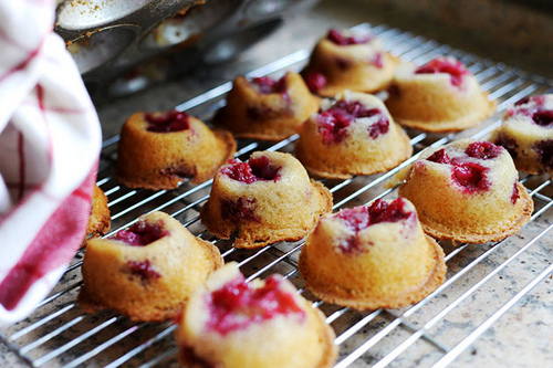 Pour 1/4 cup batter into greased muffin tins. Sprinkle a few raspberries on top.