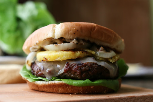 Assemble your burger by placing a leaf of lettuce on the bottom bun, then the burger, pineapple, onion and drizzle on teriyaki sauce. Liberally spread mayo on the top bun and place it on top of the burger.
