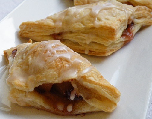 On a floured board roll the puff pastry into a 15 x 12 inch rectangle (1/2 cm thick). Cut into 4 inch X 4 inch squares. Place a heaping tablespoon of filling in the center of the pastry square. Fold the pastry into a triangle and press your fingertips firmly into the edges to seal the pastry together (if the pastry will not stick together you can use an egg wash brushed along the edges to help the pastry stick together). Place on a baking pan spaced evenly.