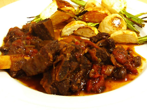 Season the short ribs well with salt and pepper. Over medium heat, brown ribs for 6 minutes on each side. You will need to do this in batches. Remove the browned short ribs to a plate and repeat with remaining ribs and oil.