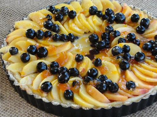 Use a pastry brush to brush the drunken preserves over the peaches, and then add the remaining 1/2 cup blueberries to the pan, and coat with the remaining sauce. Sprinkle them over the top of the peaches.