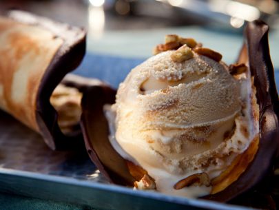 Fill the tacos with the softened ice cream and garnish with the chopped pecans.