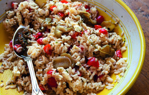 This easy to prepare delicious aubergine rice salad packed full of Mediterranean flavours makes terrific picnic fare and an easy mid-summer lunch or dinner.