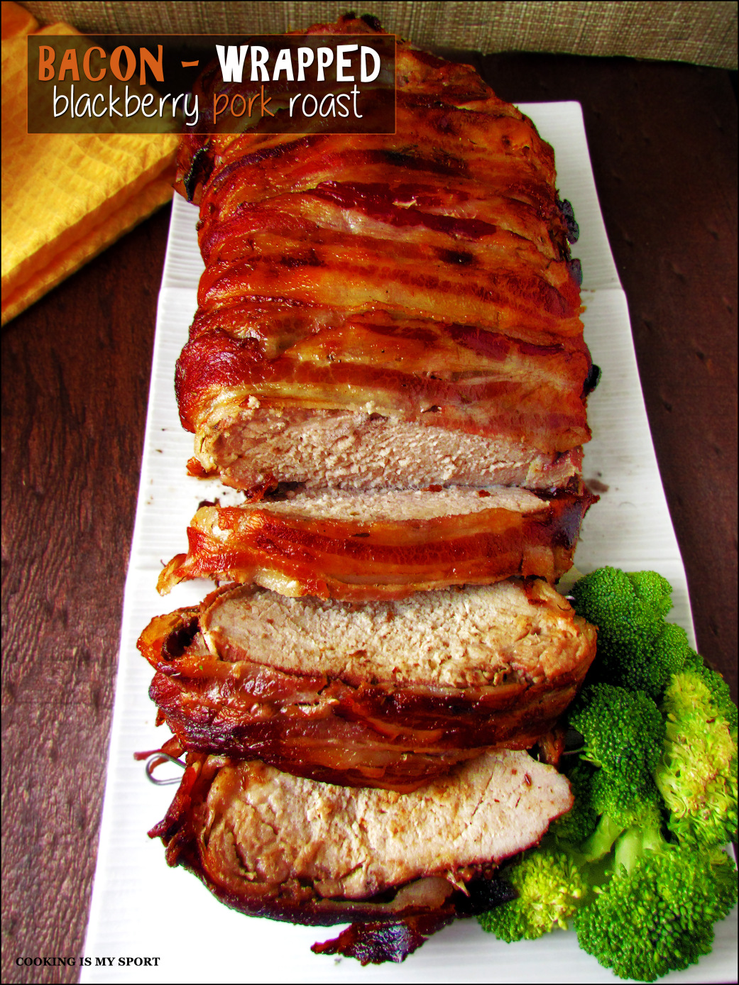 Scrumptious bacon wrapped pork roast with hints of blueberry. Serve with onions and gravy - enjoy!