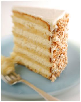 4. Spread top and sides of cake with frosting, keeping in mind you may not need to use all of it. Press toasted coconut into sides of cake; remove parchment paper strips. Chill cake at least 5 hours and up to 5 days. Slice immediately; bring to room temperature before serving.