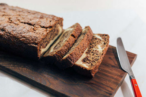 Pour half the banana mixture into greased and floured 9x5-inch loaf pan. Top with spoonsful of cream cheese mixture; carefully spread over batter in pan. Spoon remaining banana mixture over cream cheese layer; spread carefully to completely cover cream cheese mixture.