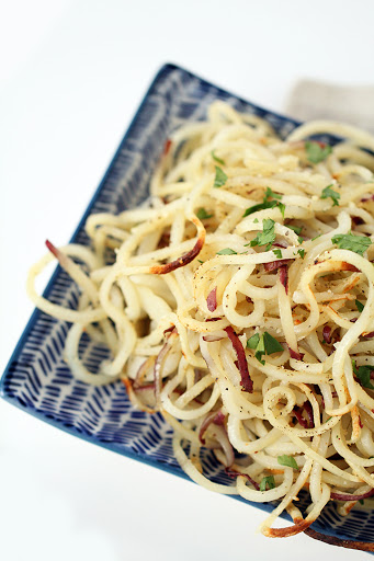 2.Place the potato noodles in a large mixing bowl immediately after spiralizing and pour over olive oil. Toss gently with your fingers to combine and then lay out on a parchment-paper lined baking sheet. Season with salt, pepper and garlic powder and roast for 12-15 minutes or until they start to turn golden brown.