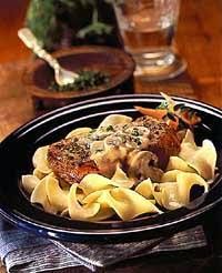 3.Whisk together sour cream, flour and mustard in medium bowl. Whisk in about 3 tablespoons broth mixture from skillet. Stir sour cream mixture into skillet. Cook, stirring constantly, until mixture comes to a boil. Serve gravy over pork chops and noodles. Sprinkle with parsley, if desired.