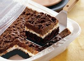 4. Measure cereal into large bowl; set aside. Melt peanut butter and chocolate chips in 1-quart saucepan over low heat, stirring constantly. Pour over cereal in bowl, stirring until evenly coated. Spread over frosted brownies. Cool completely before cutting, about 1 hour. For 20 bars, cut into 5 rows by 4 rows. Store tightly covered.