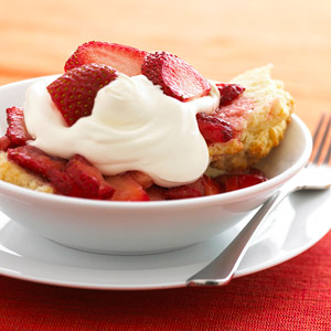 Meanwhile, combine 4 cups of the strawberries and the 3 tablespoons sugar. Using a potato masher, mash berries slightly; set aside. To serve, split shortcakes in half; fill with strawberry mixture and whipped cream. Top with remaining sliced strawberries. Makes 8 shortcakes.