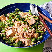 Bake tofu at 425 degrees on parchment-lined baking sheet for 10 minutes. Mix next 3 ingredients. Cook noodles according to instructions on box, adding bok choy 2-3 minutes before noodles are done. Drain; mix with sauce and tofu. Sprinkle with peanuts.
