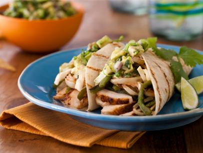 Grill the flour tortillas briefly, just to mark and heat. To build the tacos, fold each tortilla around some of the chicken, poblanos, onions, coleslaw and guacamole.