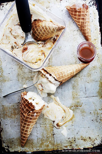 In the last 3 minutes of freezing, and while the ice cream is churning, pour about 2-ounces of the caramel sauce into the ice cream machine. You can use less or more caramel sauce - that is up to you.