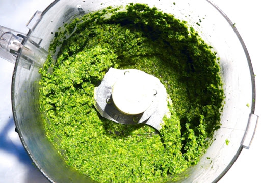 Toss everything else in a food processor. Pulse & scrape down repeatedly to insure all ingredients are are chopped to a fine consistency, trick is to run the motor as sparingly as possible so it’s heat doesn’t ’cook’ the beautiful green into a drab olive.