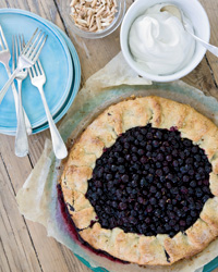 Spoon the blueberries in the center of the pastry, leaving a 1 1/2-inch border all around. Fold the pastry border up and over the blueberries, pleating it as necessary. Brush the egg white on the pastry and sprinkle with sugar. Bake for about 55 minutes, until the pastry is golden brown and the filling starts to bubble. Transfer the baking sheet to a rack and let the tart cool to warm. Cut into wedges and serve warm or at room temperature.