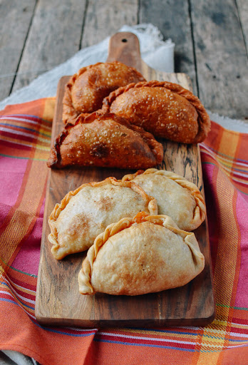If you are baking the empanadas, heat your oven to 400 degrees. Brush the empanadas with oil prior to baking, and bake for 10-15 minutes. If you are frying the empanadas, heat a small, deep pot with enough oil to submerge a couple empanadas. Heat the oil to 350 degrees, and fry the empanadas until golden brown, in small batches of 2-3 (depending on the size of your pot and your empanadas). When they’re cooked through, transfer to a wire rack or a plate lined with a paper towel to drain.