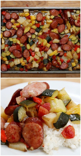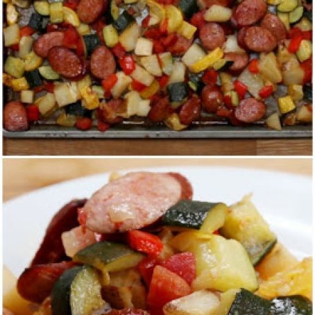 Preheat oven to 375°F. Layer all of the veggies and sausages on one or two 9x13 baking pans, depending on the size of the vegetables you use. Drizzle on olive oil, and sprinkle on the garlic, diced tomato, salt, and pepper. Bake uncovered for one hour. Enjoy!