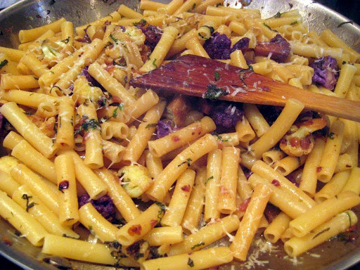 Ziti with cauliflower. Often in Italy they will cook the vegetable entirely in the pan without blanching it before. This yields a really nice depth of flavor that is really enjoyable.