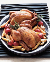 Roasted Blue Foot Chickens with Glazed Parsnips and Carrots