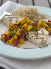 Brush fish on both sides with olive oil and season with salt and pepper. Grill fish about 5 minutes per side, until just opaque in the center. Garnish fish with mango salsa and serve immediately.