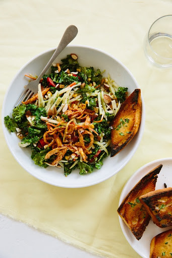 To assemble the bowls, fill large bowls with the broccoli slaw mixture. Top with a scoop of BBQ chicken and serve with a slice of garlic bread.