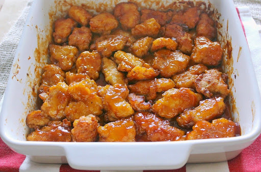. I also seasoned the flour with salt and pepper. Coat the chicken first in the flour, then dip it in the egg, then back in the flour. I gave them a quick fry just to get a crisp outer layer before putting them in the dish and pouring the sauce over the nuggets to bake. Halfway through the baking time, I gave them a quick stir, turning the nuggets over to coat them in that beautiful sauce.