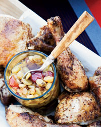 Agrodolce is the term for any Italian sweet-and-sour sauce made with vinegar and sugar. This superchunky version with golden raisins, red grapes and toasted pine nuts is more like a compote and is fantastic with spice-roasted chicken.