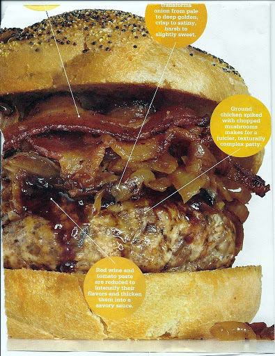MELT 3 TBL BUUTER IN LARGE FRY PAN OVER MED HEAT ADD MUSHROOMS AND COOK UNTIL SOFTENED ABOUT 8 TO 10 MINUTES SEASON WITH SALT & PEPPER TRANSFER TO A BOWL ADD GROUND CHICKEN 3/4 TEAS SALT AND 1/4 TEAS PEPPER SHAPE INTO 4 PATTIES COOK BACON OVER MED HEAT UNTIL CRISP DRAIN RESERVING 2 TBL DRIPPINGS ADD ONIONS AND COOK OVER MED HEAT UNTIL SOFTENED & BROWNED ABOUT 10 MIN IN A SMALL SAUCEPAN BRIG CHICKEN BROTH WINE AND TOMATO PASTE TO BOIL AND COOK UNTIL REDUCED TO ABOUT 1/2 CUP ABOUT 8 MIN PREHEAT BROILER IN A LARGE SAUCEPAN MELT 1 TBL BUTTER OVER MED HEAT ADD THE PATTIES AND COOK TURNING ONCE FOR 12 MINUTES BROIL ROLLS WITH BUTTER UNTIL GOLDEN PLACE PATTY ON ROLL TOP WITHY ONIONS WINE SAUCE AND BACON