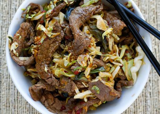 Heat 1/2 Tablespoon oil in a wok or large nonstick skillet over heat that's just a touch below high. Make sure oil is very hot before adding 1/3 of the beef in an even layer in the bottom of the wok. (If oil is not hot enough or you overcrowd the wok, the beef will steam vs sear.) Season lightly with salt and pepper then allow beef to form a crust on the bottom before flipping and stir frying until just barely cooked through. Remove beef to a plate then repeat with remaining beef, using 1/2 Tablespoon oil to stir fry each batch, and then set the plate aside.