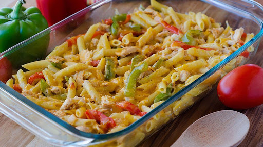 In large bowl, toss together cooked pasta, bell peppers and onion, 1 lb shredded cooked chicken breast, 1 package Old El Paso™ taco seasoning mix and 1 cup whipping cream until combined. Pour into baking dish.