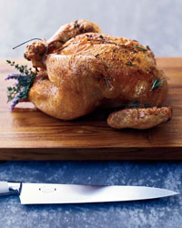 In a glass measuring cup, combine the stock and wine. Baste the chicken with 2 tablespoons of the stock and wine mixture. Turn the chicken on its side and roast for 10 minutes. Baste again, turn the chicken on the other side and roast for another 10 minutes. Reduce the oven temperature to 350° and baste, then roast the chicken for 15 minutes longer. Turn the chicken breast side down, baste and roast for 15 minutes. Turn the chicken breast side up and baste. Roast the chicken for about 25 minutes longer, basting once. The chicken is done when the juices run clear and an instant-read thermometer inserted in the inner thigh registers 165°.