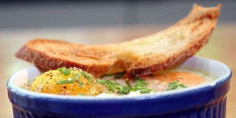 2. Set the ramekins in a baking dish and pour hot water in the dish to come half-way up the sides of the ramekins. Bake until cooked, but still jiggling, 5 to 7 minutes. Serve with buttered toast fingers for dipping.