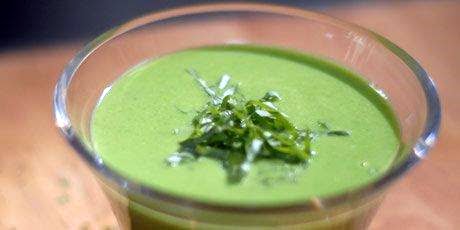 1. Bring 1-1/2 cups/375 ml water to a boil in a saucepan with a pinch of salt. Add the peas, bring back to the boil, cover, and cook until soft, about 10 minutes. Blend to a purée with an immersion blender. Strain into a clean saucepan. Stir in the cream, reheat, and serve with chopped mint scattered on top.