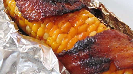 Place the wrapped corn on the preheated grill, and grill on high heat until the corn is hot, about 10 minutes per side. Turn the heat to Low, and grill the corn until the bacon is cooked and the corn is tender, about 45 minutes.