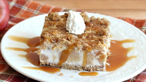 3 In a large mixing bowl, add the softened ice cream and stir in the apple pie pieces and caramel sauce. Pour the mixture over the crumbs in the 8x8-inch baking dish. Sprinkle the remaining crumbs over the top, cover with aluminum foil and freeze for at least 3 hours.