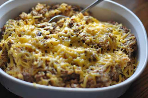 Fry bacon until crisp and drain. Add onion, green pepper to drippings in pan and cook until tender. Add rice; cook until golden. Stir in beef and garlic cooking until beef is almost done. Stir in water, tomato sauce and seasonings. Heat to boiling reduce heat and simmer for 20 minutes. Spoon half meat unto 2-quart casserole. Sprinkle with half of the cheese and add remaining meat. Top with the rest of the cheese and bacon. Bake at 400 degrees for about 15- 20 minutes.