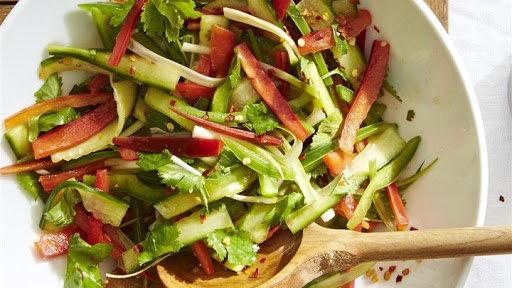 Transfer cucumber to a fine-mesh sieve, rinse, and drain well. Whisk together vinegar, sesame oil, crushed red pepper, and remaining 1/4 teaspoon salt in a large bowl. Add cucumber, green onions, bell peppers, and cilantro, and toss well.