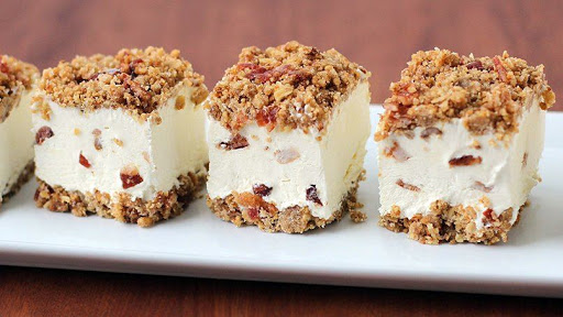 Yep, bacon is now for dessert, too! Bacon is cooked with brown sugar and the whipping cream is flavored with bourbon to make this delicious dessert.