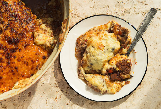 Heat oven to 400°. Place the reserved potato slices in the bottom of an oval 3-qt. baking dish (or two 1 1⁄2-qt. baking dishes) and season with salt and pepper. Put the eggplant slices on top, season with salt and pepper, and then cover with the meat sauce. Pour the béchamel over the top of the meat sauce and spread evenly with a rubber spatula. Sprinkle parmesan evenly over the top and bake until browned and bubbly, 45–50 minutes. Let cool for at least 20 minutes before serving.