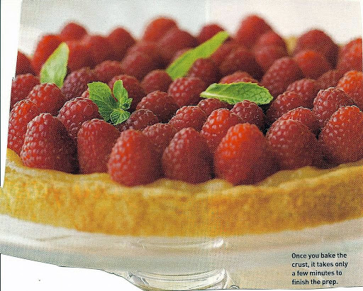 HEAT OVEN TO 350 GREASE 9 INCH SPRINGFORM PAN IN BOWL WORK DOUGH AND LEMON ZEST TOGETHER IF DOUGHG IS TOO SOFT REFRIGERATE 10 MIN PRESS DOUGH EVENLY IN BOTTOM OF PAN AND 1/2 INCH UP SIDES BAKE FOR 20 MIN UNTIL CRUST IS BROQN AND SPRINGS BACK REMOVE SPRINGFORM TO RACK CAREFULLY REMOVE CRUST FROM PAN COOL COMPLETELY SPREAD LEMON CURD OVER CRUST AND TOP WITH RASPBERRIES