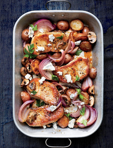 Place a large heavy roasting pan over high heat. Sprinkle pork evenly with 1/4 teaspoon salt and 1/4 teaspoon pepper. Add 2 tablespoons oil to pan; swirl to coat. Add pork to pan; cook 3 minutes on each side or until browned. Place pork on a plate (pork will not be cooked through). Reduce heat to medium-high. Add potatoes to pan, cut sides down; cook 2 minutes. Remove pan from heat.