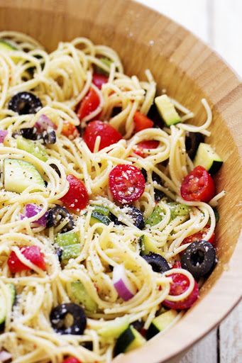 A delicious spaghetti salad filled with fresh summer veggies and olives. Topped with a zesty italian dressing and parmesan cheese, this will be the hit of your next gathering!