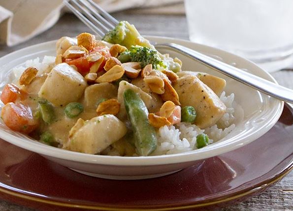 5. Serve the chicken over hot rice and top with chopped peanuts.