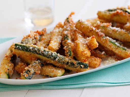 When the oil is hot, working in batches, fry the zucchini sticks until they are golden brown, about 3 minutes. Using a slotted spoon, transfer the fried zucchini to paper towels and drain.